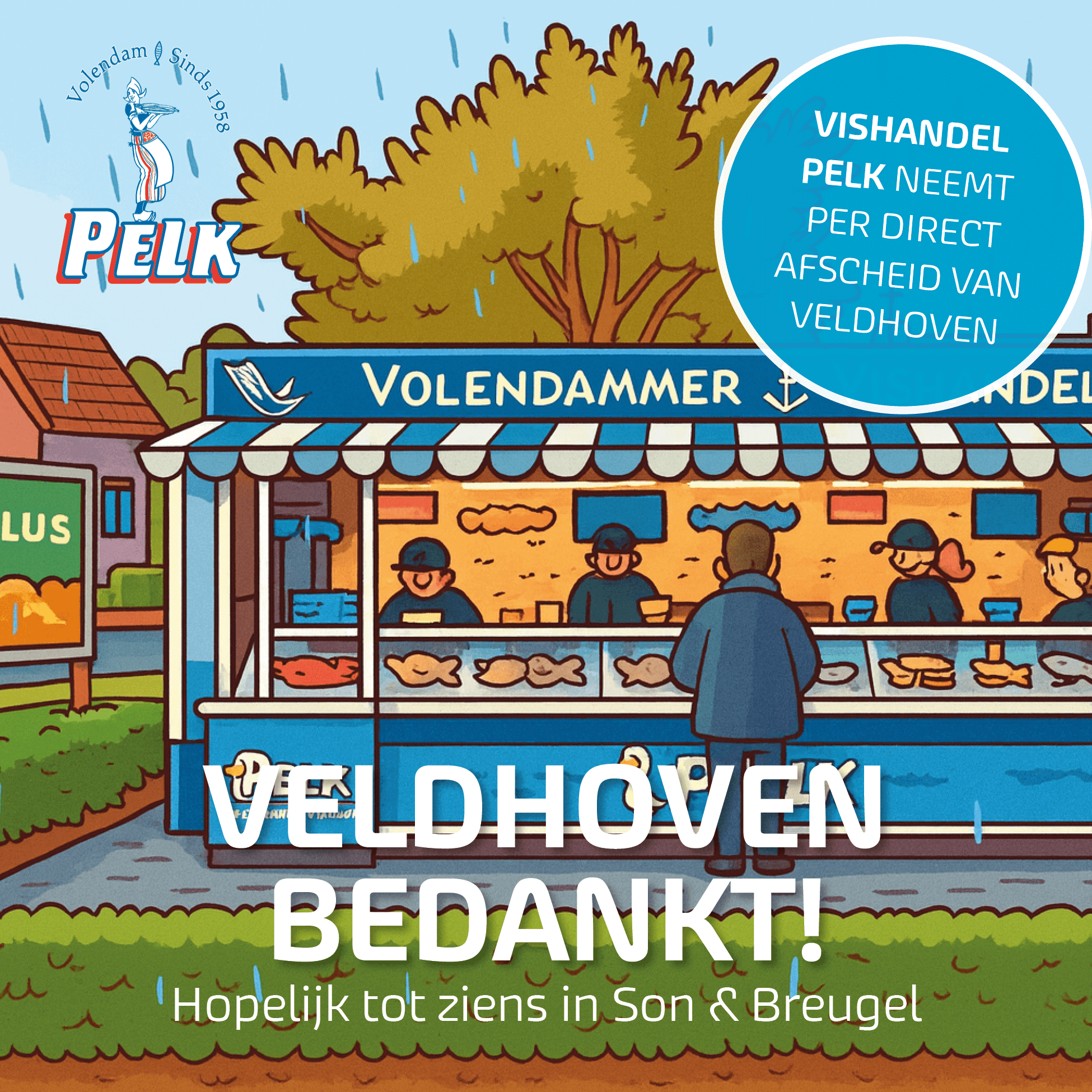 Met ingang van vandaag, 28 oktober 2025, neemt Vishandel Pelk afscheid van haar standplaats in Veldhoven ‘De Plaatse’. Na 70 jaar komt er een eind aan vis op vrijdag van Pelk in Veldhoven. Hopelijk zien we jullie nog eens langskomen in Son & Breugel voor een lekker visje of een goed gesprek. Wij danken iedereen voor de jarenlange klandizie en gezelligheid. Tot ziens in Son & Breugel!